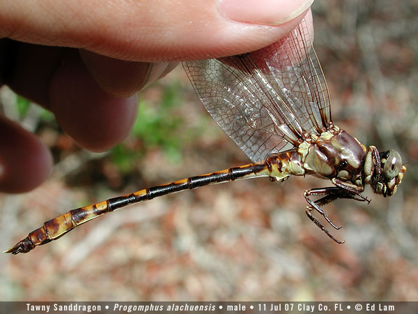 | Florida, July 8 - 13, 2007 After the Southeastern DSA meeting in Georgia I crossed back into the Florida panhandle. The Blackwater River in Okaloosa Co., FL was my destination to look for a couple of Stylurus species. These are called the "hanging" clubtails, a reference to their habit of perching on vegetation instead of rocks or on the ground. I was not disappointed. In the late afternoon I caught two female Towne's Clubtails, Stylurus townesi, and saw a couple more. The access to the Blackwater was easy enough at a boatlaunch and picnic area but there were some waist-deep stretches making wading difficult. A male eluded me at one of these deeper spots so I needed to try again the next day. July 9: The next morning I saw a Russet-tipped Clubtail, Stylurus plagiatus, and a few more Towne's including a tandem pair that flew by out of reach. I found a male Towne's caught in a spider web but what remained was too consumed to be any use as a specimen. Without success I headed a short distance to Sweetwater Creek in Santa Rosa County where a couple of Georgia River Cruisers, Macromia illinoiensis georgina patrolled beneath the road crossing. There was also a couple of big Blackwater Clubtails, Gomphus dilatatus which were so aged and unwary that I could almost catch them with my fingers. Jerrell Daigle suggested Sweetwater Creek for Yellow-sided Clubtail, Stylurus potulentus but warned it might be already too late in the year. Sand-bottomed and relatively shallow, the creek was fairly easy to follow and wade. I went upsteam a ways before finding a small clubtail, which turned out to be another female Towne's. A little later I flushed another clubtail from a tree but couldn't follow where it went. I waded further but turned around where some trees had fallen and the stream got deeper. But back where I had flushed the clubtail I spotted a dragonfly perched head high in a small tree. I caught it and was pleased to find it was a male Yellow-sided Clubtail. Its lemon-yellow thorax contrasting with its bright blue eyes was a striking combination. I had expected the males to be worn down or gone and felt lucky to find a male in such good shape. But I still needed a male Towne's. I had seen plenty of females over two days, about a dozen compared to 2 or 3 males, an unusual ratio for dragonflies on their breeding grounds. As I worked back along the Sweetwater I finally managed to net a male but it's thoracic pattern was unusually dark. I tried the Blackwater River again (too many human swimmers), then back to the Sweetwater but I couldn't find another male Towne's. I did catch two female Yellow-sided Clubtails in the late afternoon at Sweetwater. Then I drove on to Tallahassee. July 10: I've been fortunate not to have too many days where I have been shut out but today was one of them. I met up with Jerrell in the morning and we set off to look for 3 or 4 species of southern Somatochloras, Emeralds. We saw a few individuals, perhaps a dozen, along a dirt road in Liberty County but neither of us could catch any. We speculated that the regional drought had dwindled the nearby streams and with them, the dragonfly numbers. But it was also very hot that morning so maybe we just didn't get out early enough. July 11: The next morning I got on the road earlier but saw even fewer Emeralds, just 4 or 5 flying high and out of reach. I could not tell which species they might have been. Soon the temperature rose and those few were quickly gone. Ringo Starr's version of "It Don't Come Easy" came on immediately on the car radio. Not wanting to waste the day I decided to drive into the Florida peninsula and look for Purple Skimmer, Libellula jesseana. This odd skimmer is restricted to a precious few pristine sand-bottomed lakes in Florida, ones with little shoreline vegetation. My destination was a known location for the species in a park in Clay County, over 200 miles away. It was hot, steamy but cloudy when I arrived in the mid-afternoon. I easily found the lake but didn't find any dragonflies during my first circuit of the shoreline. Working away from the water along the brush, I saw a what I thought was a female but then spotted a blue-gray dragonfly with orange wings, a male Purple Skimmer. I was warned they could be hard to catch (especially later in the day after they warmed up) but this one had caught some prey so it was occupied and approachable. I did not see any others. When the sun peeked out a few male Tawny Sanddragons, Progomphus alachuensis appeared, perching along the lake edges. This was another target species. A female Sanddragon flew in, laid some eggs then zipped away but it's escape didn't bother me too much since Giff Beaton had provided a female specimen a week ago at the DSA meeting. I was going to linger at the lake to see what else I could find but another thunderstorm arrived, chasing me off to the shelter of the car. But I had found my targets so I decided to make the long drive back to Tallahassee (but without a female jesseana, as the "female" I found turned out to be a young male Golden-winged Skimmer, Libellula auripennis - a real bonehead mistake). July 12: The heat was starting to take a toll and I wasn't too anxious to get going the next day. I spent the the afternoon at another Sweetwater Creek (in Liberty County) looking for a female Royal River Cruiser, Macromia taeniolata which I didn't find. There are some larval records at Sweetwater for Dromogomphus armatus, Southeastern Spinylegs so when I saw a couple of big dragonflies with orange abdomen tips I was hoping they were this species. Instead they turned out to be Two-striped Forceptails, Aphylla williamsoni, still a treat to see. I tried again for Somatochloras in the late afternoon. In the fading light there may have been a couple flying along the dirt road but they eluded my attempts to catch them. July 13: Being the last full day of my trip I had to make one last try for Emeralds. Was it the heat and the sustained drough