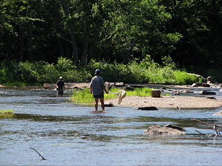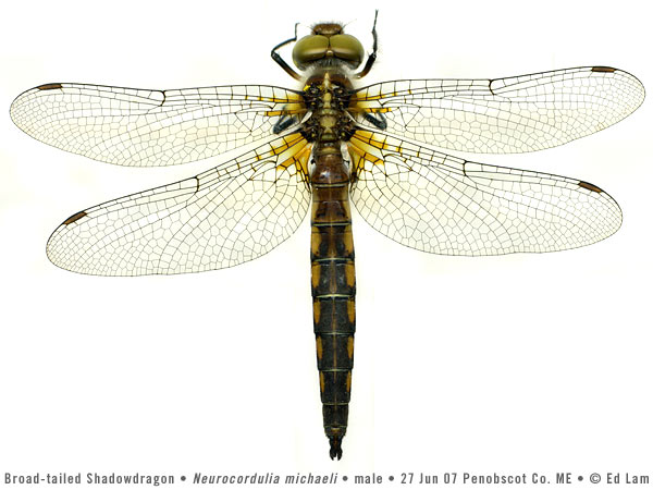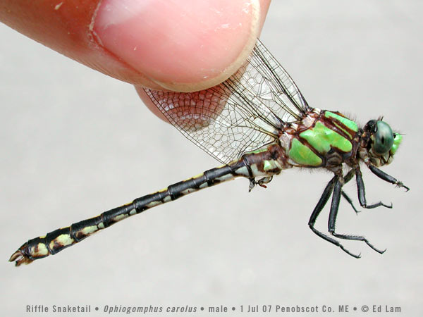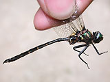 |  | | Subj: June 26 - July 1 in Maine For a little variety I asked Kristine Wallstrom if she could write a short account of our recent trip to Maine. She is president of the NY chapter of NABA (North American Butterfly Association) and enjoys observing, identifying, and photographing all manner of flora and fauna, from wildflowers to birds to tiger beetles. Tuesday, June 26 Tom Fiore and I, Kristine Wallstrom, provided company and help with driving and directions in Ed Lam's quest for northern dragonflies, mainly the Somatochloras, the Striped Emeralds, and the Ophiogomphids, the Snaketails. The 7 hour drive to Lincoln, Maine from my apartment in the Bronx didn't seem that long with shared driving, the excitement of the hunt, new places and new odes. In fact, after checking into a motel in Lincoln that would be our base for the next 6 days, we had time to locate the gravel road bordering the 1000 Acre Heath that held Somatochlora promise, and waded into the Penobscot River after 7pm hoping for more than the Didymops, Basiaeschnas, and Macromias that were still coursing up and downstream. After Tom and Ed each netted a couple of Neurocordulia yamaskanensis, Ed caught a male of the smaller and sought after N. michaeli. Success! Kristine omitted the part where I got the car stuck in the mud on the way to the 1000 Acre Heath. The shoulder looked deceptively dry as I steered to avoid a couple of large rocks in middle of the dirt road. It was hot dirty work but we dug ourselves out again. Broad-tailed Shadowdragon, Neurocordulia michaeli was one of my primary targets so despite our long and exhausting day,we had to take advantage of the warm temperatures and try for them at dusk. The Stygian Shadowdragon, N. yamaskensis was the more conspicuous of the two Neurocordulia species on the river. They flew faster, and often over calmer stretches of water making them easier to see than the michaeli, which flew over the riffles. Michaeli flew slower and it surprised me when one seemed to float slowly upwards at me and I caught him chest high. With michaeli I have seen every shadowdragon species this year and only failed to collect N. molesta.  1000 Acre Heath, Penobscot Co. ME Wednesday, June 27 We're back on Weir Pond Road bordering the heath this morning, hoping for a good Somatochlora catch, but notice very few Emeralds flying, quite a difference from Blair Nikula's report of hundreds of Baskettails flying overhead in his 1999 and 2002(?) trips, reported in Argia. Same place, different year and conditions... today there are precious few. We spend all day with these challenging Striped Emeralds, patrolling only occasionally amongst the more common American Emeralds and abundant Racquet-tailed Emeralds. Today is hard work! We walk/drive to a river at the end of the road and on the return, later in the afternoon there are a few more Emeralds flying. Ed manages to net S. brevicincta, S. kennedyi, and S. minor. We're back to the Penobscot River in the evening, this time having eaten first (when restaurants are still open) and with insect repellant! It's after 8pm and things are flying in beautiful evening light. I manage to net-rescue a N. yamaskanensis that was stunned by a leaping fish and was floating downstream with the current. Placed on vegetation, it whirred itself dry. Just as it was getting too dark to see well, Ed scoops up a female N. michaeli. A great ending to a long day. My itinerary was drawn from the previous travels and discoveries of Paul Brunelle and Blair Nikula. Blair had detailed a couple of trips to the region in the DSA publication, Argia, and what he found was essentially my target list. The rarest emerald they found was Quebec Emerald, Somatochlora brevicincta. The male and female netted by Jeremiah Trimble in 1999 were the first U.S. records of this species. I hoped for but did not expect to find it myself but caught a male feeding back and forth along the road at 1000 Acre Heath. In addition to the Emeralds Kristine listed above we also caught S. walshi (Brush-tipped), S. franklini (Delicate), and S. forcipata (Forcipate). It was a beautiful evening on the Penobscot except for the lightning in the distance. Not exactly what you want to see while wading in water, holding a metal net pole, and underneath a powerline stretching over the river. Thursday, June 28 We decide to head north and west to a site for Lanthus parvulus, Northern Pygmy Clubtail, and Tom and I think the gravel road out of Crystal Station not far from the clubtail site, with bog on one side and wetlands on the other might have patrolling Emeralds. Tom nets a female Lanthus at the Hale Brook site where Calopteryx aequabilis and amata, River and Superb Jewelwings are also flying. The gravel road at Crystal Bog and the RR tracks are a big disappointment and a waste of 2 - 3 hours. But it's so beautiful here I say lamely, I'm not here for the scenery says Ed! This is a time, travel, and money consuming quest. Ed vows only to go to known places with good directions for species known to fly there. I understand; in this case, time is money! Returning to Hale Brook, our spirits are lifted when Ed catches a male Lanthus parvulus. Weather had a lot to do with us heading north that day. We had hoped for sunnier conditions as the hot and humid weather had been replaced by cool temperatures and clouds, conditions not favorable to dragonfly hunting. For this project I need to find too many species and my schedule does not allow much time to explore new localities. I'm looking for the surest bets as possible, going where a species has been found, hopefully recently and with some frequency.  Machias River Friday, June 29 There's more consistent sun today, but quite windy. We decide to drive south to the Machias River and hope for better luck with the Ophiogomphids - howei and anomalus in particular, than we had with the Somatochloras. It seems too early in the day for the wide Machias, so we try another site where a small st