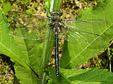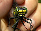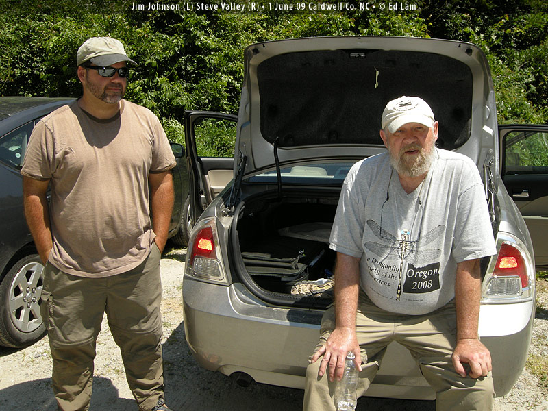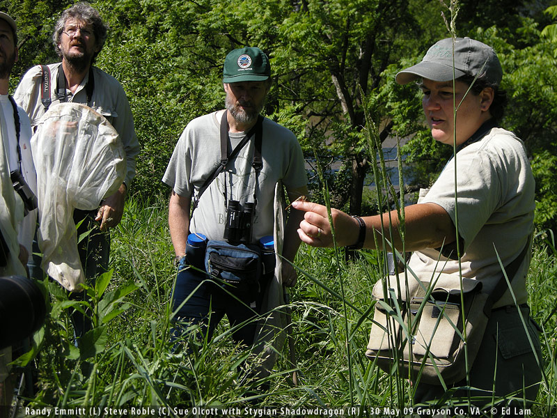 Dragonfly Society of the Americas Southeastern Regional Meeting May 29-31, 2009, Galax, Virginia The start of my dragonfly year came late this year. I delayed travel to save a little money. The project still has 2+ years to go and the advance is almost gone. I thought about going to Florida and Texas but I've done those trips before. I had fewer targets and the ones I still needed were the ones I was less likely to find. So I let them pass this year. I did get to see some live dragonflies in March. Steve Krotzer overnighted a couple of male Robust Baskettails, Epitheca spinosa from Alabama. What fun it is to get live dragonflies in the mail. I took them outside to photograph them in the sun and it was so cold here in New York that they could hardly move. Six months go by surprisingly fast. I had a commission to paint a group portrait of all the Presidents of the United States. As the spring approached I promised to work on rehabilitating the backyard. I pulled weeds and dug new garden beds. Planted sod and perennials; some took and some died. Got a nasty case of poison ivy and had creeping itchy rashes for weeks. We bought a used wooden swing set, disassembled, moved, rehabilitated and reinstalled it in time for our oldest boy's fourth birthday. Seven cubic yards of playground mulch carted and spread. I worked a bit on the book's layout, trying to fit what I want to have within the confines of Peterson field guide. How I wish the page size was larger! I thought it would be a problem when I signed onto the project and it has been a struggle. But I'm determined and committed to having the illustrations as large as possible, avoiding the main problem that has plagued some of the previous dragonfly guides. After a first pass of laying out the plates, I revised my list of dragonfly targets which remains frighteningly long. The SE DSA meeting in western Virginia would by my first opportunity to trim it down a little. Thursday, May 28: I left home at 8:30AM for the long drive to Galax. It was cloudy and in the sixties in New York, I hit bands of rain on the way southwest, finally finding some sun and a little warmth crossing into Virginia. I pulled into the motel in Galax a little before 6PM and was greeted by some familiar faces. The supper of pulled pork was pretty good but the peach cobbler was disappointing. Friday, May 29: The group met at 9AM in the motel parking lot. It was a large gathering, about 30 people or so, which is huge for a Southeastern DSA meeting. I jumped into a vehicle with Marion Dobbs of Georgia, Steve Valley of Oregon, and Jim Johnson of Washington and we followed the caravan to a public boat launch on the New River. The river was high and brown from the recent rains. The morning was cool but not unpleasant. I walked a small grassy field with Giff Beaton hoping to find a Pygmy Snaketail, Ophiogomphus howei one of the main targets for the meeting. Jerrell Daigle had found them in these fields in years past, perched "on the buttercups." The field was devoid of dragonflies and we saw only a handful Powdered Dancers, Argia moesta, young males without the powder-like pruinosity they would develop later. Others found teneral Black-shouldered Spinylegs, Dromogomphus spinosus, a Common Sanddragon, Progomphus obscurus. Gradually the list of species lengthened. Springtime Darners, Basiaeshna janata and Common Baskettails, Epitheca cynosura flew along the banks. Eastern Least Clubtail, Stylogomphus albistylus and Black Saddlebags, Tramea lacerata. Southern Pygmy Clubtail, Lanthus vernalis was seen along a nearby stream, Brown Spiketail, Cordulegaster bilineata flew at another. At a pond near a group of lazing cows flew various skimmers, libellulids, and a few damselflies. I found lonely buttercups. Our next stop along a creek was not very productive. Someone in the group caught a female Snaketail, which we puzzled over for a bit before deciding it was a Brook Snaketail, Ophiogomphus aspersus. I only saw an Eastern Forktail, Ischnura verticalis. Later I spotted a clubtail on a rock in the stream but as I made my way closer it was gone. We decided to head back to the New River where we didn't find anything different. All day long the sun had played hide and seek with the clouds. It never really felt warm and in the afternoon a cool breeze blew. It wasn't dragonfly weather and we called it quits at 4PM. Although I didn't find anything I needed, it was a nice first day in the field. All the dragonflies were first of the year and the company was good. Saturday, May 30: I started again at 9AM with the same companions as the day before. Again we headed for the New River but at a different crossing. The morning was cool and the grass was wet. First dragonfly: a Common Sanddragon. An teneral dragonfly was spotted high up in a tree overhanging the water still clinging to its larval shell. Through binoculars we surmised it was a shadowdragon, Neurocordulia. Using all my extra net handles and borrowing a couple more I managed to knock it down into the water. Stygian Shadowdragon, Neurocordulia yamaskanensis. I gave the specimen to Steve Roble for the VA DNR collection. The morning continued slowly. Half-heartedly I tried to catch a high flying Common Baskettail and by 11AM we were about to leave to try another location. Then things started showing up. First Randy Emmett spotted another Shadowdragon perched in the grass. It flushed but landed in a tree where I caught it with my long net, a female Stygian. Then a large clubtail was seen. It flew from a small tree but landed on a log near the water's edge. I netted it, a male Splendid Clubtail, Gomphus lineatifrons which turned out to be a fairly common species at the site. While some of us were admiring this big clubtail, Bruce Grimes caught a dragonfly that nearly landed on him. Pygmy Snaketail! A beautiful little thing. Jerrell reported seeing another male on the other side of the river but as far as I know these were the only ones seen at th